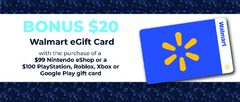 $99 Nintendo eShop or a $100 PlayStation, Roblox, Xbox or Google Play gift card. Receive one (1) $20 Bonus Walmart eGift
