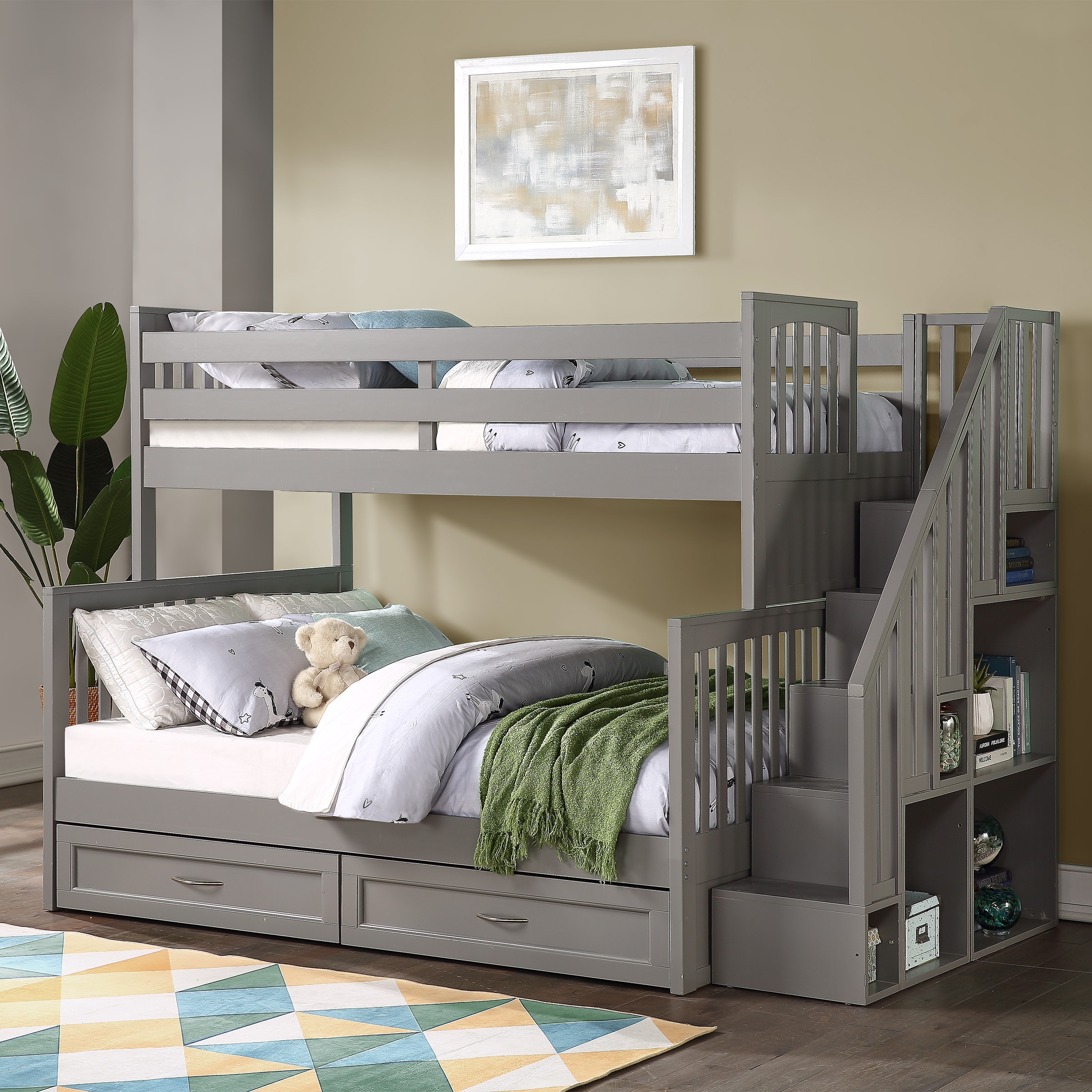 [$300 OFF] Vandalay Twin Over Double Bunk Bed with Stairs and Storage Drawers, Grey