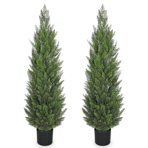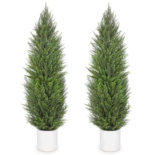 Arborus 5ft Artificial Topiary Trees Faux Cedar Trees Cypress Trees in White Planter for Home Outdoor Decor, Set of 2