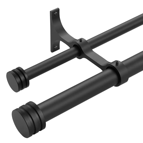 Double Curtain Rods with Aluminum End Cap and Full Enclosure Brackets, 1- Inch Front and 5/8 Inch Back Window Rod, Dual Drapery Rods Adjustable from 36 to 72 Inches (3-6 Feet), Matte Black