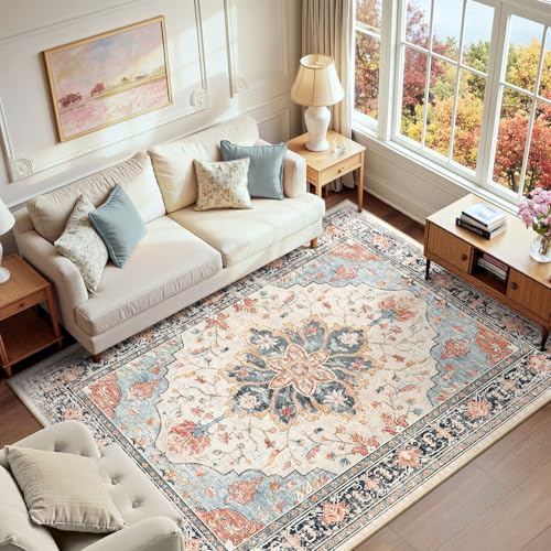 RELEANY Area Rug 6x9 Washable Rugs for Living Room, Non-Slip Floral Vintage Distress Print Pattern Medallion Carpet for Bedrooms Dining Room, Beige Navy Blue Orange Colorful
