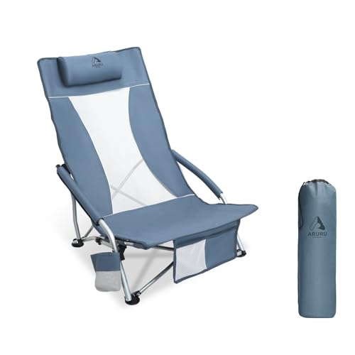 ARURU Low Folding Beach Chairs for Adults, Portable Lightweight Sling Beach Camping Chair with Cup Holder,Headrest, Foldable Camp Lawn Chair for Outdoor Sand Concert Sport Events