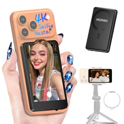 Moman Phone Vlog Selfie Monitor Screen for iPhone 7-17 & Android, 3H Battery 1080P/4K Magnetic Back Camera Wireless Monitor for Selfie Vlog Tiktok YouTube Video Record Live Content Creation, Black