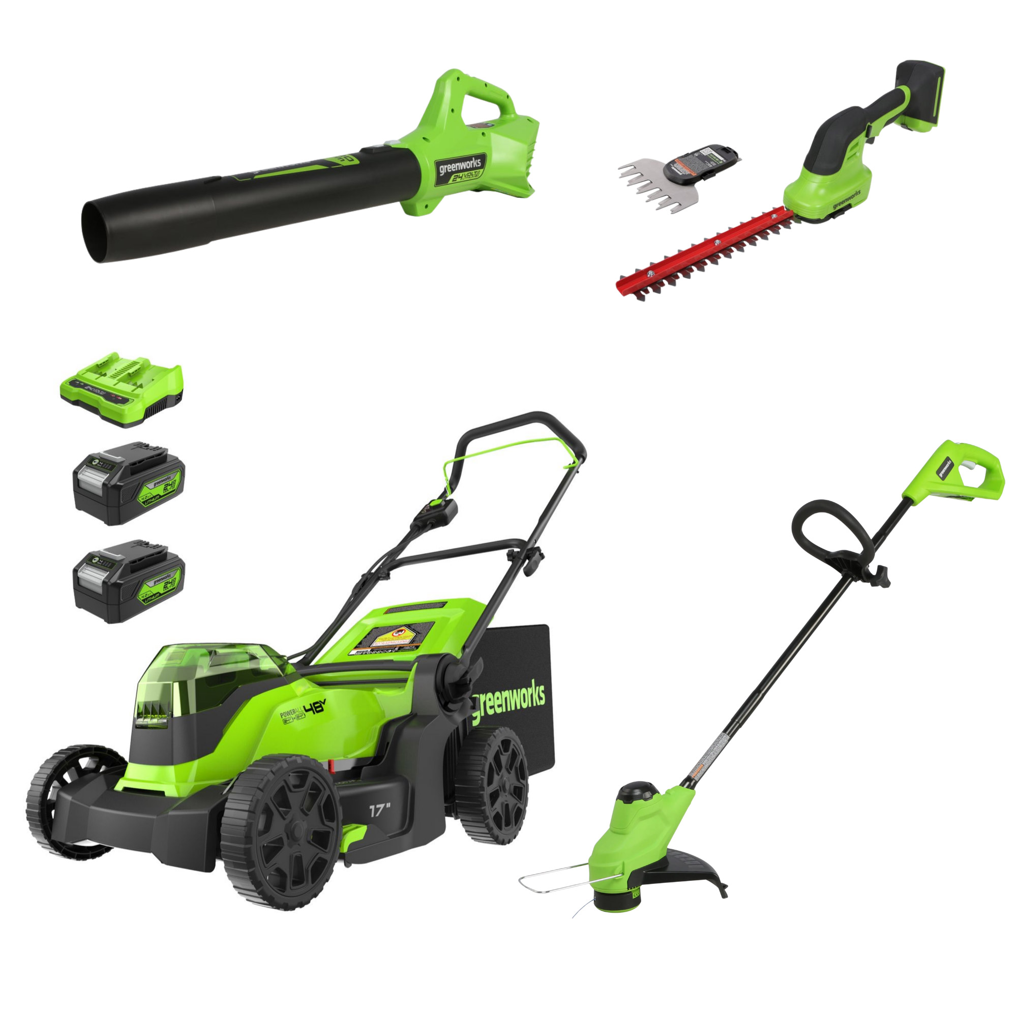[$150 OFF] Greenworks 24V 4-piece Combo – 17” Mower, 12” Trimmer, 320 CFM Blower, Shrubber Shear, (2) 4.0Ah Batteries & Dual-Port Charger